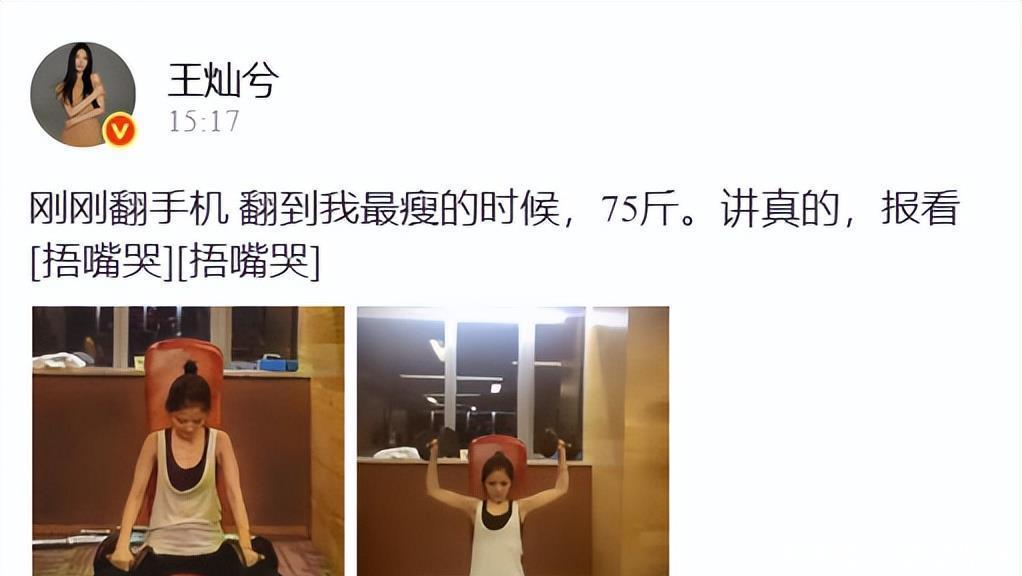 还配文刚刚翻手机翻到最瘦的时候75斤讲真的不好看之前王灿就说自己过于瘦所以生病现在再看到这最瘦照才发现她说的是真的了脸颊上一点没有肉两条腿就跟筷子一样那个时候的王灿都瘦到75斤了还在不停的健身真是让人佩服。